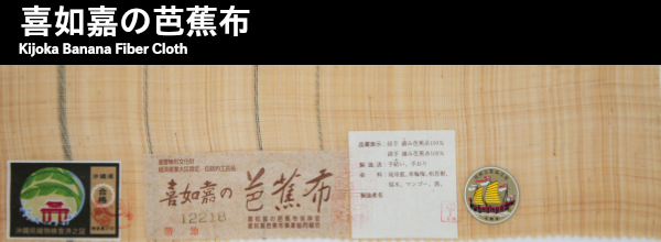 Originating around the 13th century, Kijoka Banana Fiber Cloth is made by hand-spinning thread taken from the bark of the ito bashō variety of banana tree, ikat thread is hand bundled, dyed in plant dyes made from the Strobilanthes cusia or Rhaphiolepis umbellata plants, and then woven into cloth. This style of weaving is unique to Okinawa and has been loved by people since long ago for its light, smooth texture.