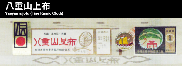 The origin of Yaeyama Jōfu is unknown. According to records, it was known as a tributary cloth presented to Satsuma in the early 17th century. With ramie as the base material, kasuri splashed patterned fabric is either hand-woven or imprinted. Vegetable dyes such as Ryūkyū indigo and that of the kūru plant (plant of the yam family) are use as dyeing material. Made for use during the summer, it is a white fine weave in which kasuri splashed patterns are expressed on white cloth.